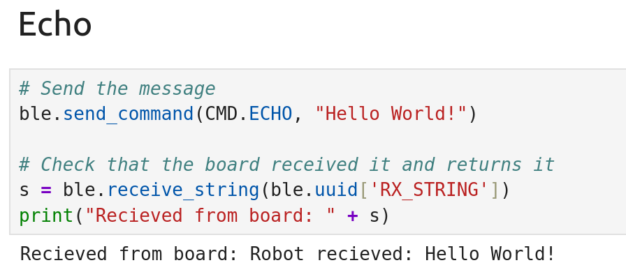 After setting up my Bluetooth, I tested the connection from Jupyter to the Artemis using the ECHO command. This command sends a string to the Artemis, and then the Artemis sends the string with some modifications back. The outputs from both the board and Jupyter can be seen in Figures 5 and 6.