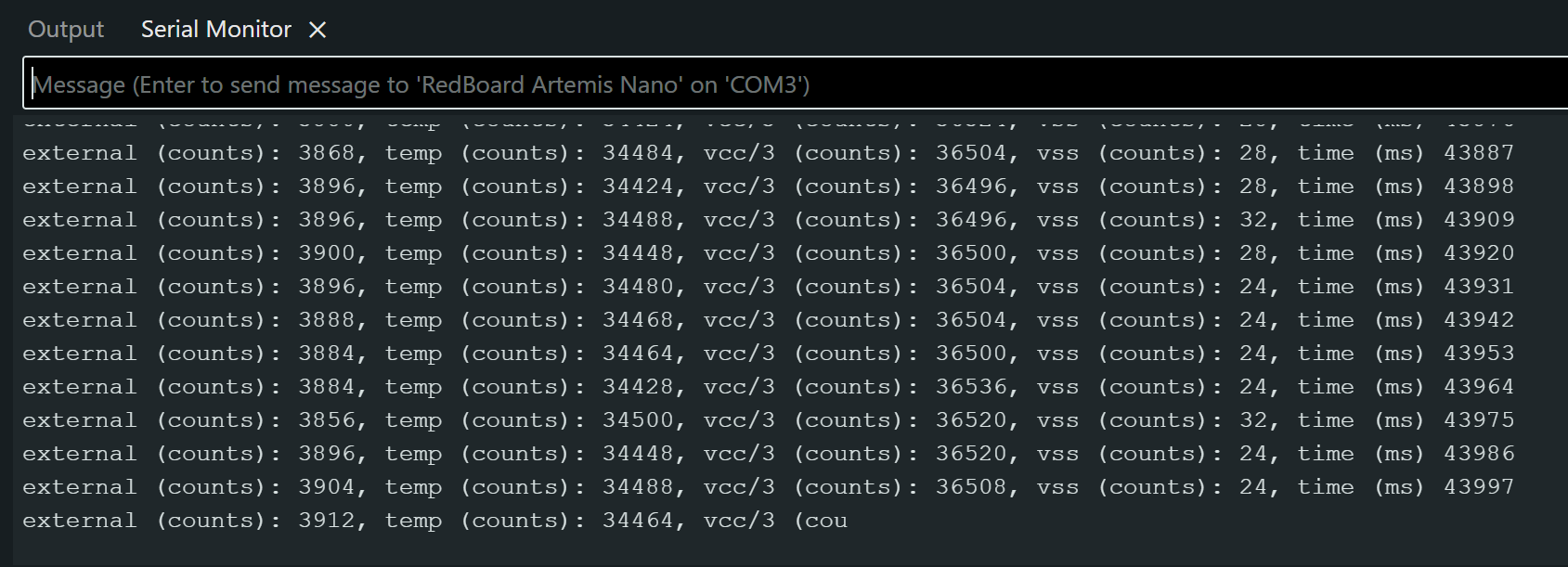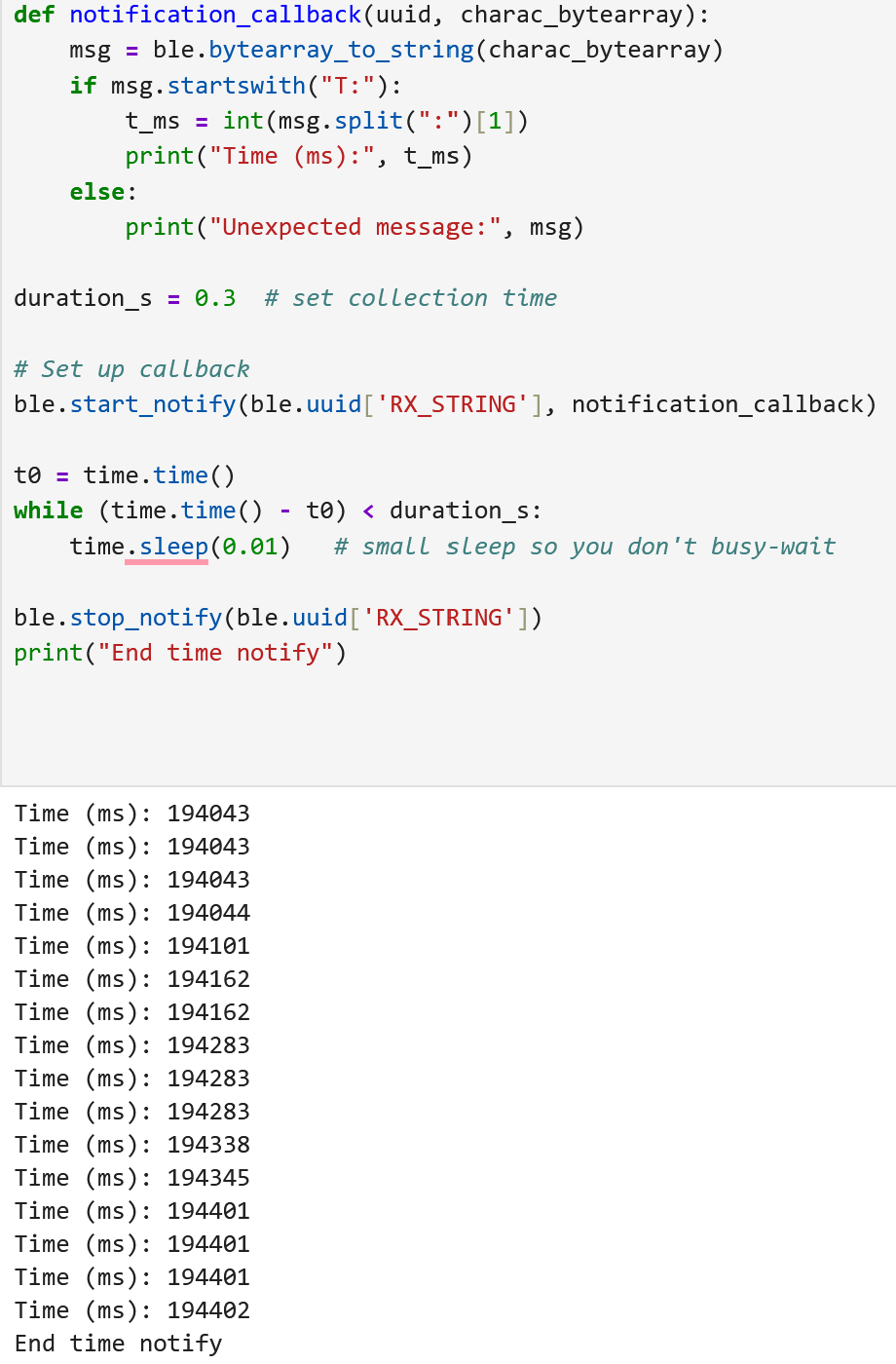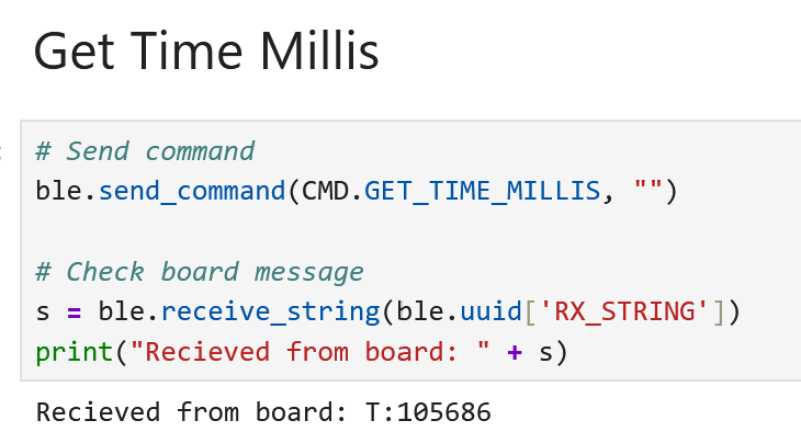 With the basics of being able to send and recieve data done, the next task was to set up a notification handler in Python. The purpose of this task was so the Artemis could put a value on the BLEStringCharactersitic at any time, and the Python code would automatically recieve the value without having to command the Artemis. To start, the handler received the time similar to the GET_TIME_MILLIS command, and extracts the time. The next section will discuss the Artemis posting notifications. I tested the handler by making a simple function that would transmit the current time once during every loop() to verify that the handler received it. Figure 9 shows the data being received in Jupyter. I was also asked to calculate the data transfer rate.