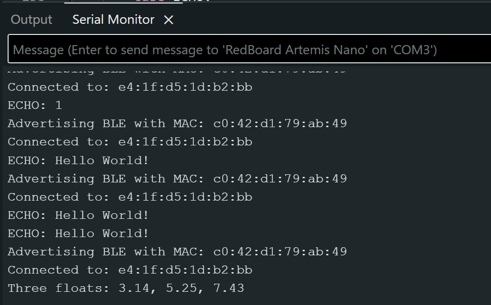 After verifying that the ECHO command works, I used the SEND_THREE_FLOATS command to send three floats to the Artemis. The Artemis then had to verify that three floats were sent, and extract them as floats. The serial output of the SEND_THREE_FLOATS command are in Figure 7.