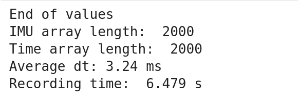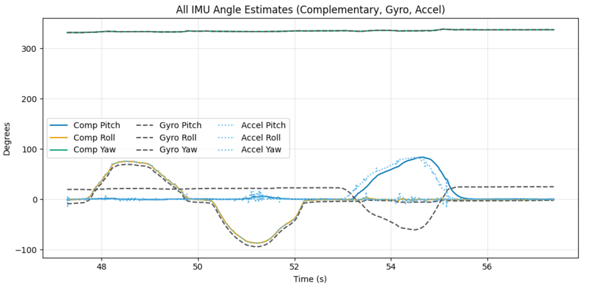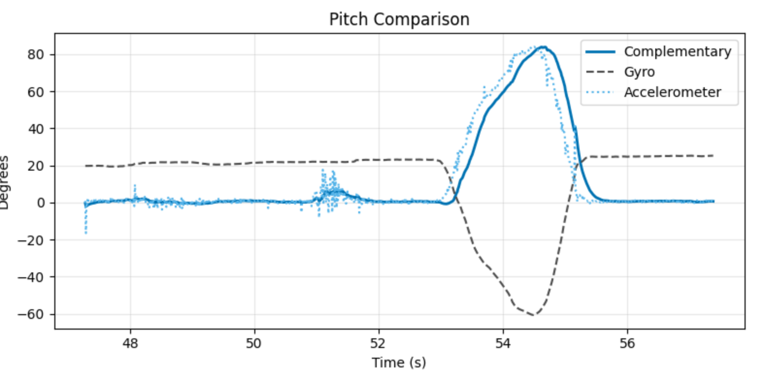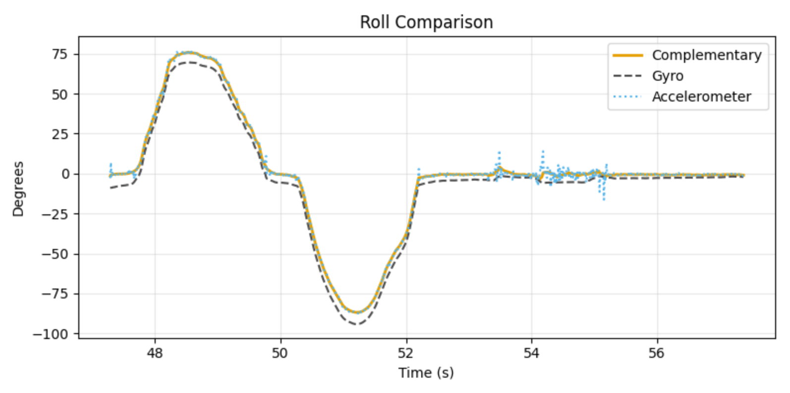 The larger concern is the use of floats. Each float is 32 bits, so an Attitude is 96 bits. With an array size of 2000 samples to capture 6.47 seconds of data, this requires about 24 KB just for the complementary filter output. The compiler reports 22.3% RAM usage. Much of this precision is likely unnecessary, since attitude values are bounded within ±90°. Switching to 16-bit integers would halve the memory requirement, but would restrict values to integers. A more efficient option would be a 16-bit fixed-point representation, where some least significant bits encode fractional values. This would require a custom implementation, which is why I did not use it here. If RAM becomes constrained, this would be a way to reduce usage.