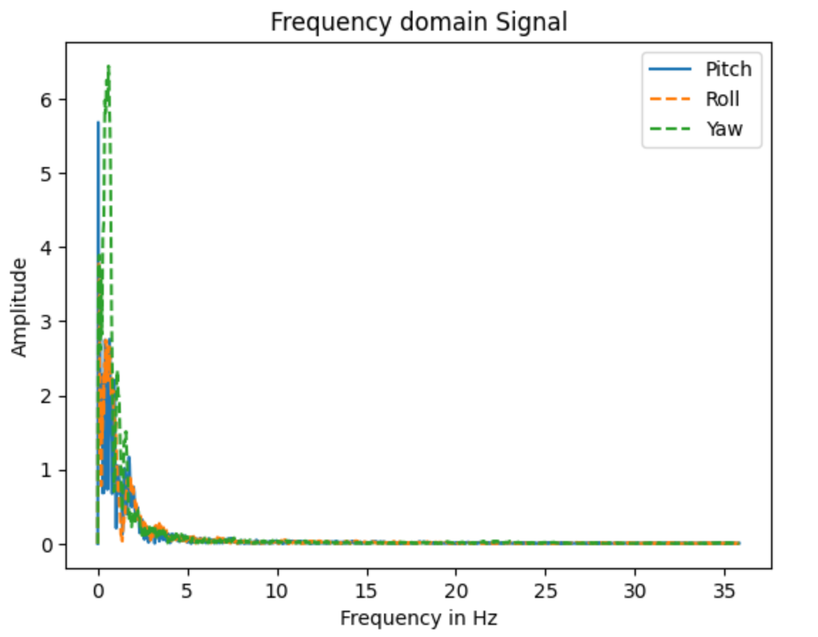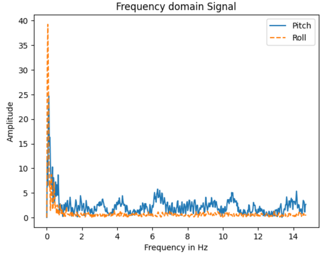With this data, I could figure out what cutoff frequency to use for a low pass filter, and the associated alpha value. A low pass filter is used to filter out some of the noise and frequencies that I don’t want the IMU to read. The alpha value is used to weight the low pass filter, and is determined by the cutoff frequency.