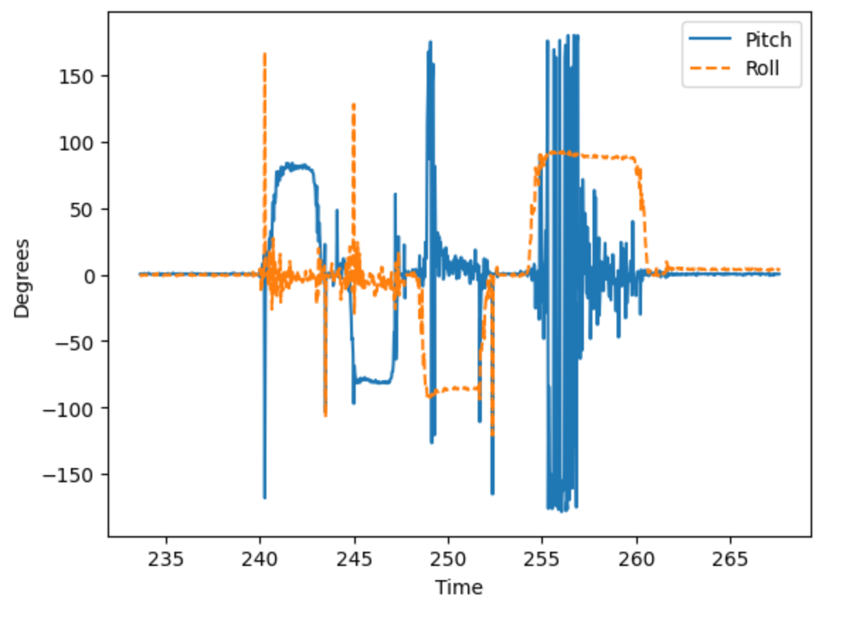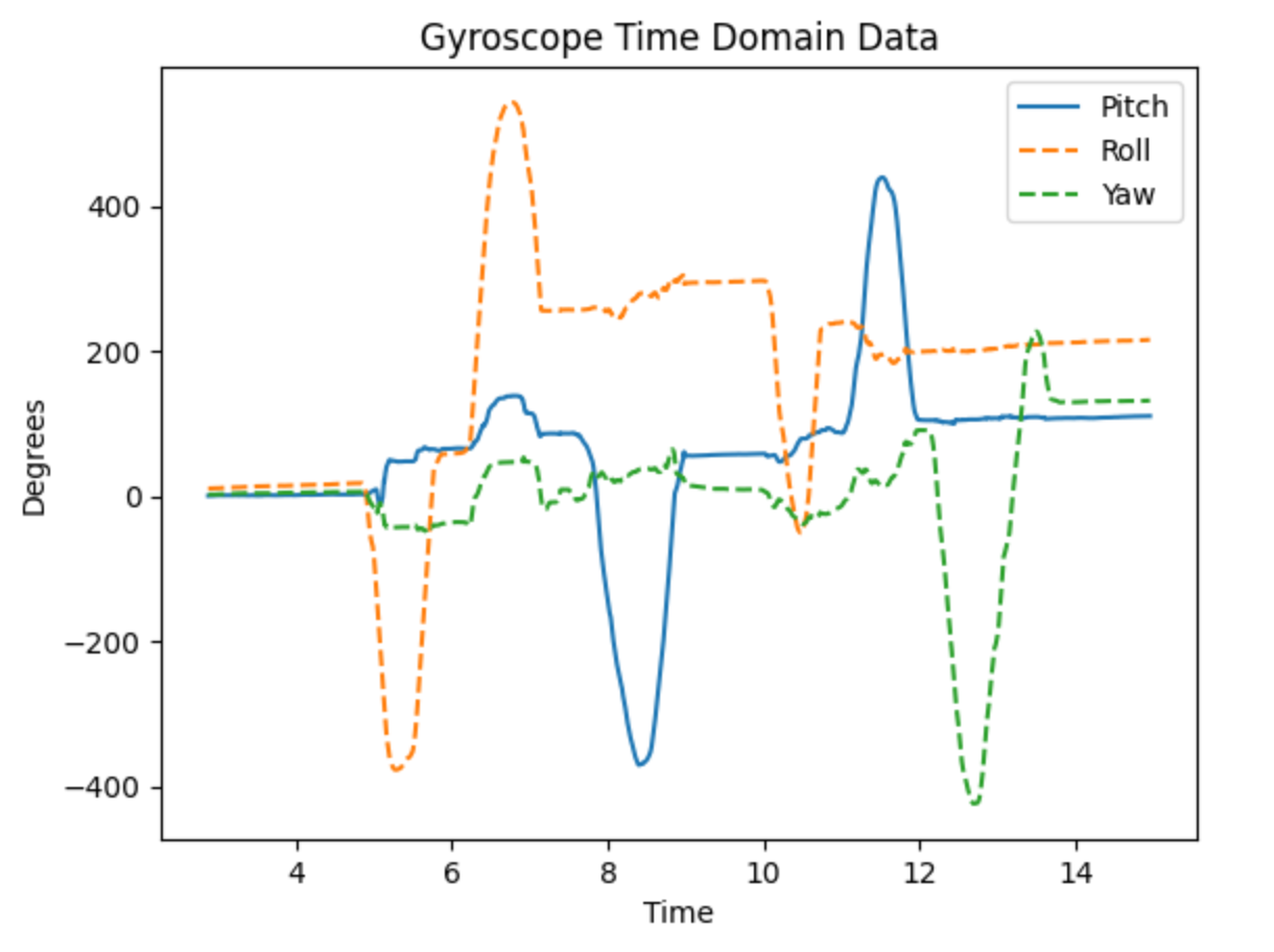 With the accelerometer filtered, it was time to look at the gyroscope. The gyroscope measures rate of change, so in order to estimate the pitch and roll, we start with an initial value (assumed to be 0 in this case) and integrate the values.