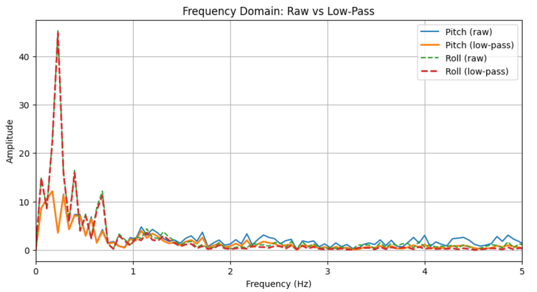 I tested the filter, and compared the raw data to the filtered data, which can be seen in Figure 4. The LPF seems to be working, as the filtered response is generally much smoother than the raw data. There is still some bumps on the graph, but mostly when I am moving the IMU myself.