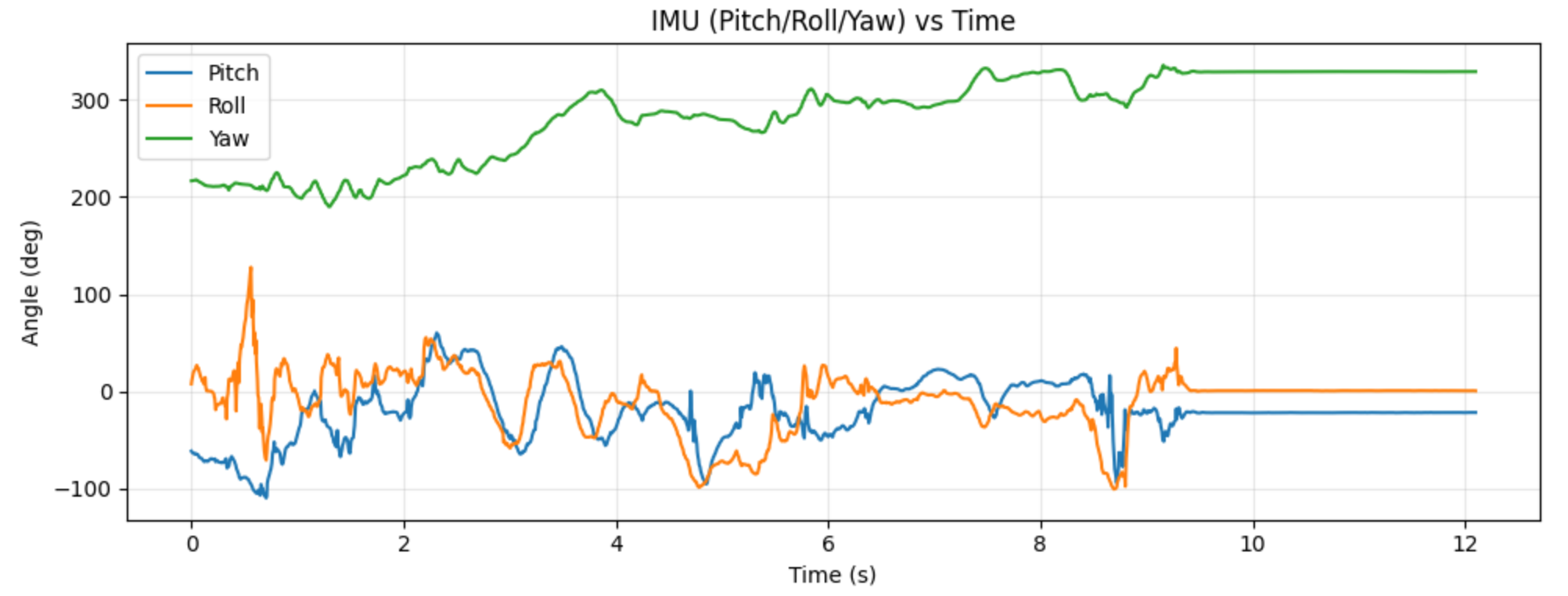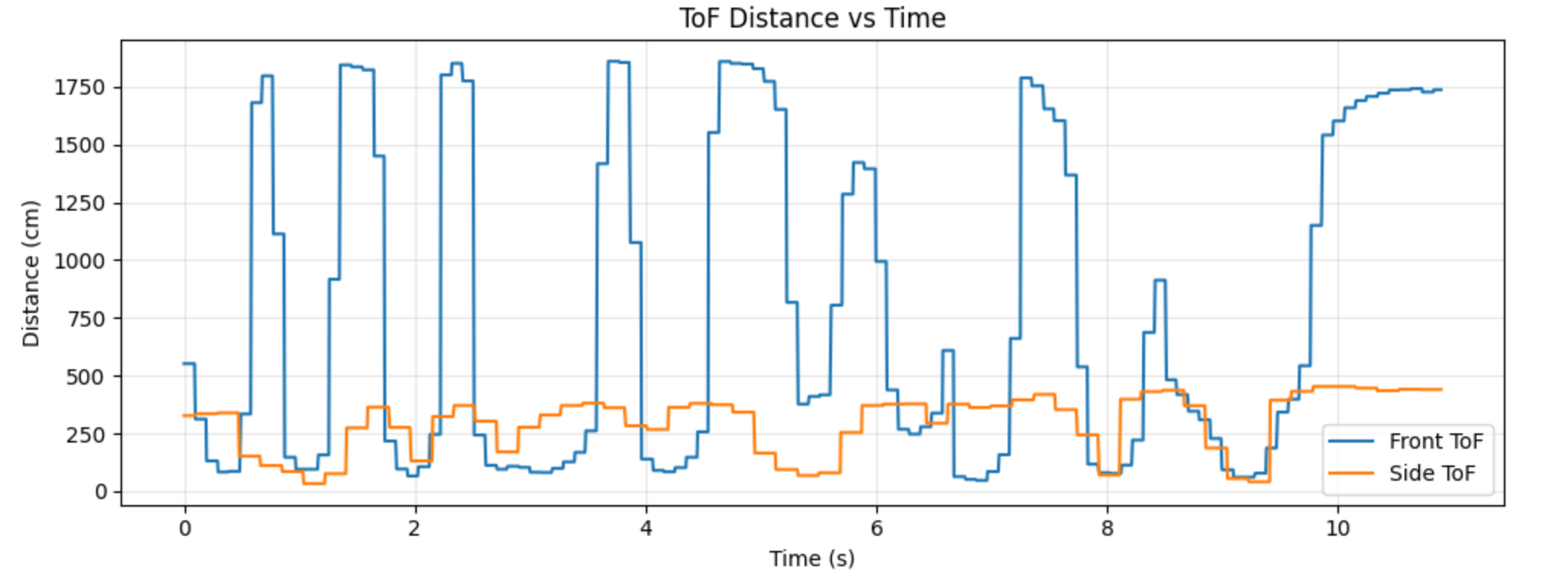 With both ToF sensors working, I had to store ToF data over time and send it to the Artemis via Bluetooth. I also sent IMU data to show that I could both. The graphs of each are shown in Figures 12 and 13. I sent about 12 seconds of data, and it probably took 30 because of how much data there was and how slow Bluetooth is. My current sending architecture is only suitable for logging data, not real time transmission.