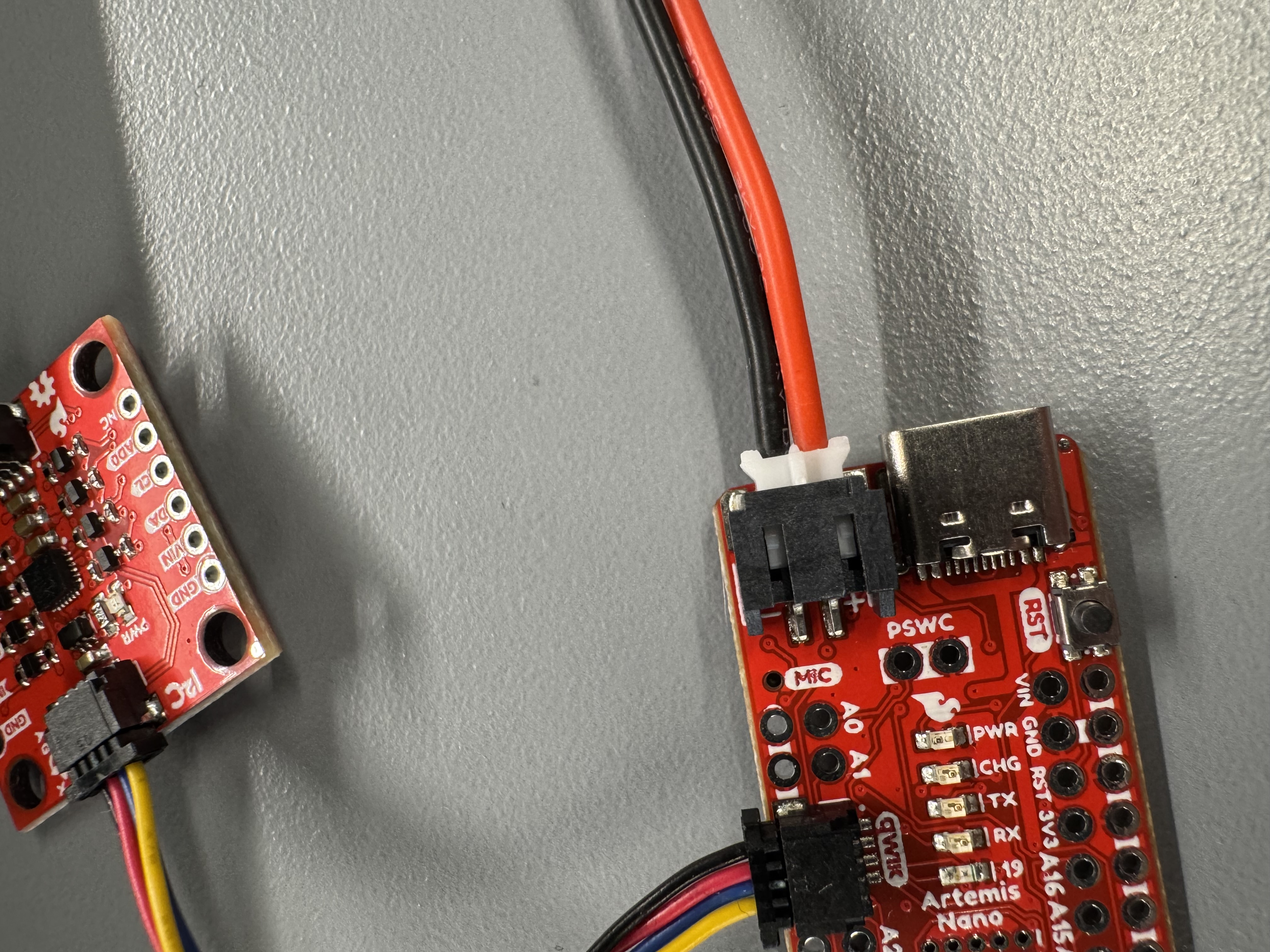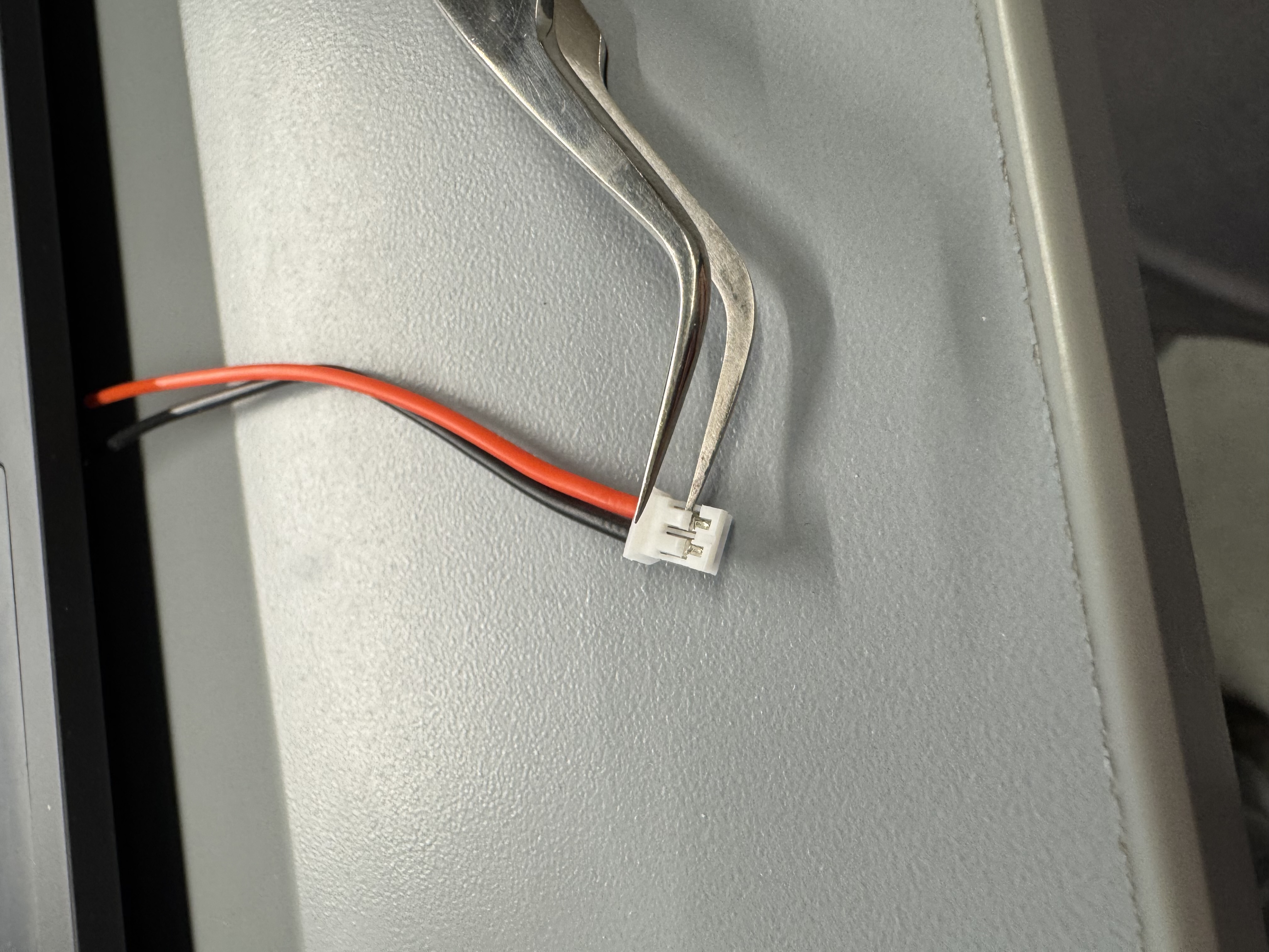 As part of this lab, we had to power the Artemis with a battery. Part of this included soldering a JST connector on the battery. The default JST polarity was inverted, so I would have had to solder the red battery lead to the black JST lead. This bothers me at a fundamental level, so I used a pair of tweezers to pull the wires out of the JST connector, and swapped them so all the wire colors matched. Figure 3 shows the swapping technique, and Figure 4 shows the polarity going into the Artemis.