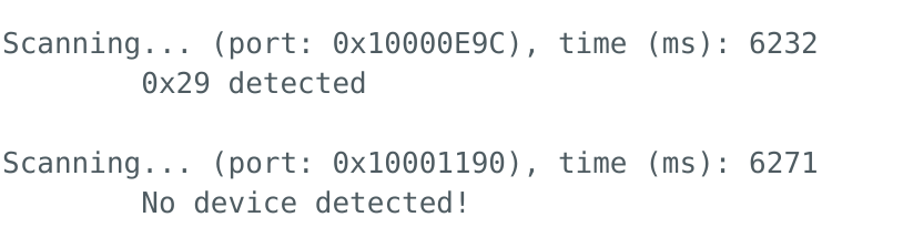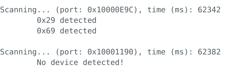 With the soldering done, it was time to start the software portion of the lab. First, I ran the build in Example05_wire_I2C which scans the I²C bus and prints the addresses of anything connected. I started by plugging in one ToF sensor, and the output is shown in Figure 5. It showed 0x29 as expected. I then plugged both ToF sensors in without changing the code at all. This is shown in Figure 6, and shows no addresses on the bus. Finally, Figure 7 shows one ToF sensor and the IMU to show that both sensors work when connected.