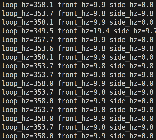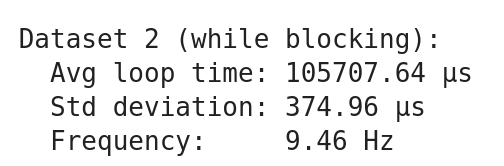 I ran a minimal test by printing the time since the last data was ready in a loop, and recorded that data. I tested both the while and if versions, and found that the frequency of the loop of each, shown in Figure 10. I found that the while version had a loop frequency of 9.46 Hz, while the non blocking version had a loop frequency of 224.27 Hz, a massive improvement. Both versions had a sensor frequency of around 10Hz. This makes sense because the Sparkfun VL53L1X has a timeout budget which is set to 100ms by default. The timing budget is what sets how long the sensor looks for a return signal. In the non-blocking version, the Serial prints is still probably what is limiting the speed, because Serial is slow.