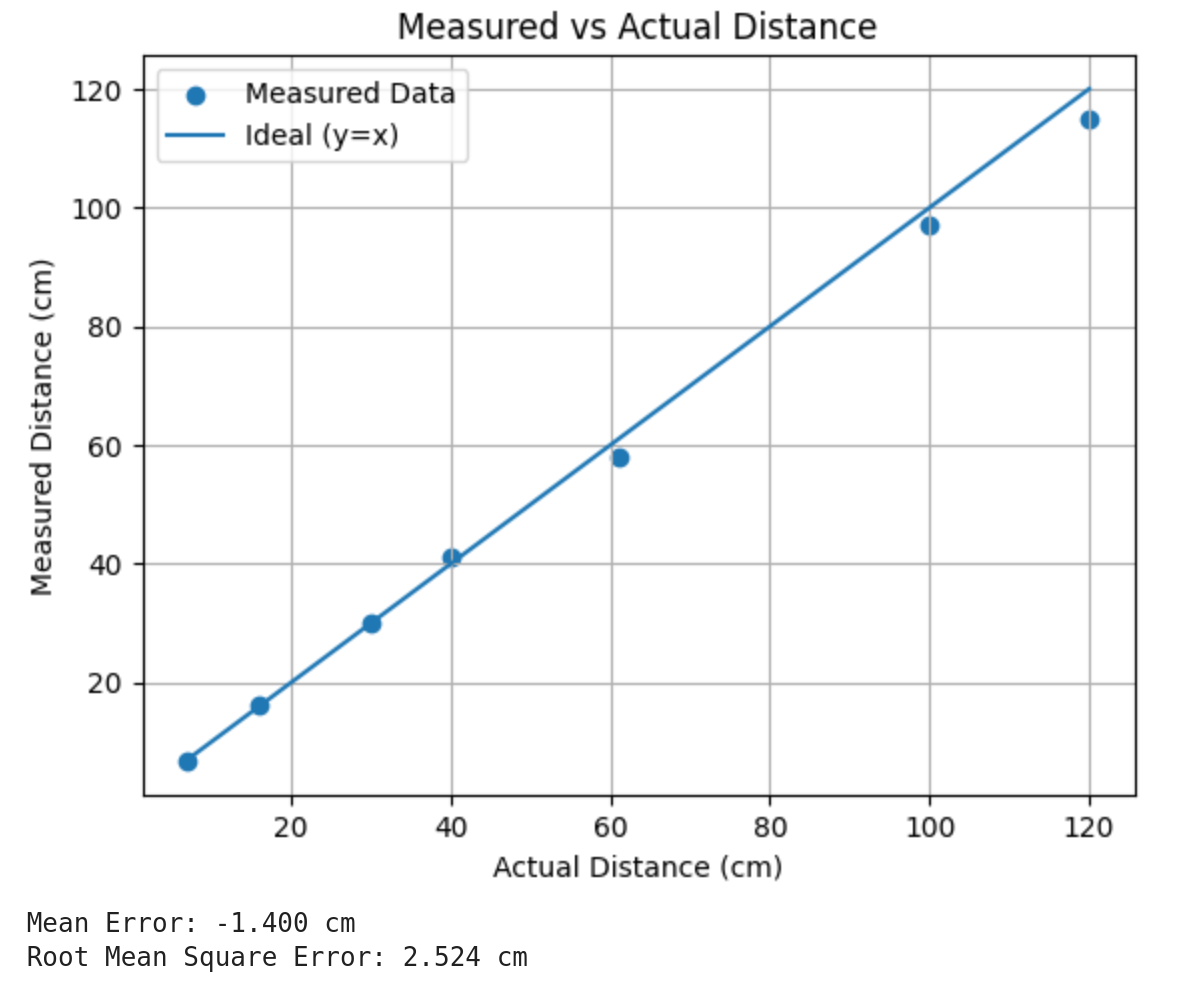 With the sensors working, I then had to test the accuracy of the sensor in one of the modes. I decided to use short mode, because I was working with Immanuel Koshy who was measuring long mode (See his page for his analysis). We had a large level with centimeters on it, and positioned the sensor at the end and used a storage bin lid at fixed distances and recorded the sensor measurement. The measurements are shown in Figure 8, and the setup is shown in Figure 9. I found that for the sensor I measured, it was very accurate at short distances, but at further distances it had a larger error. The average error of the sensor was -1.4 cm.