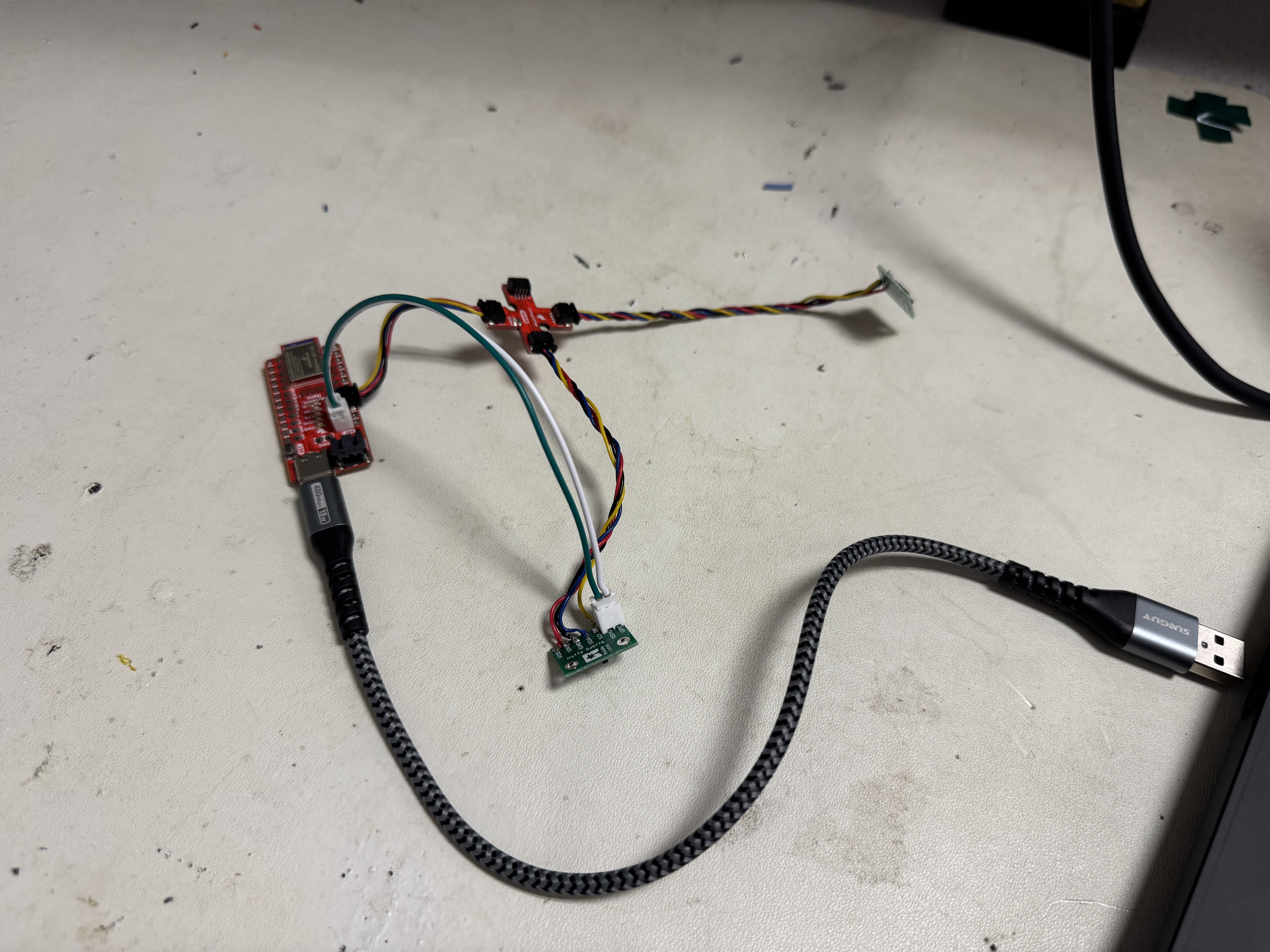 Now that I had the ToF and IMU working, I had to think about how to collect data. The ToF sensors and IMU have different sample rates, and I need to make sure that the microcontroller runs fast, and none of the sensors block each other. To do this, I updated the IMU and ToF sensors independently each loop. This ensures that every sensor will be up to date. I also printed all the raw data from the ToF sensors and IMU over Serial and used SerialPlot to show them all working at the same time. The generated plot is very hard to read, but was all the data from the sensors. This is shown in the video below.