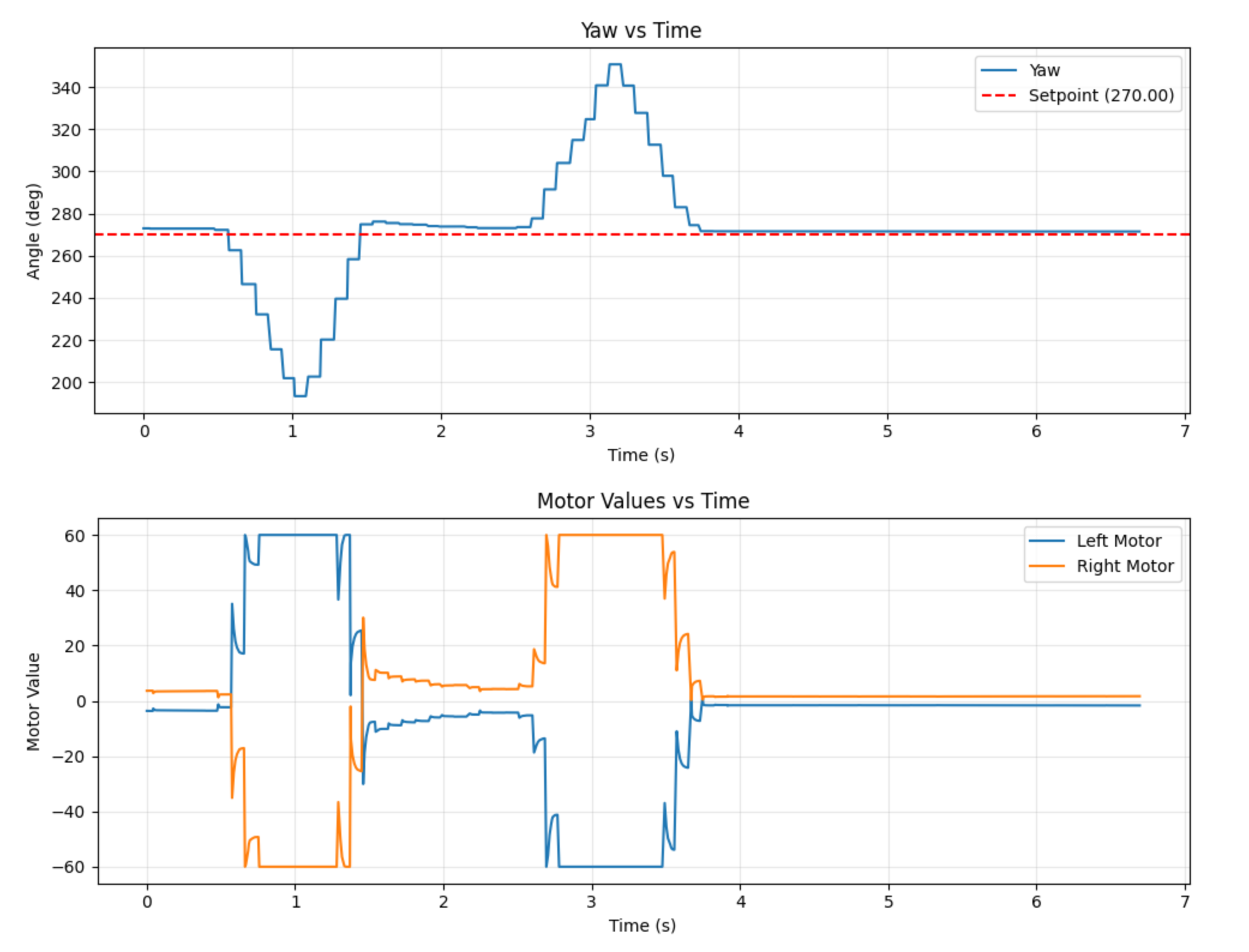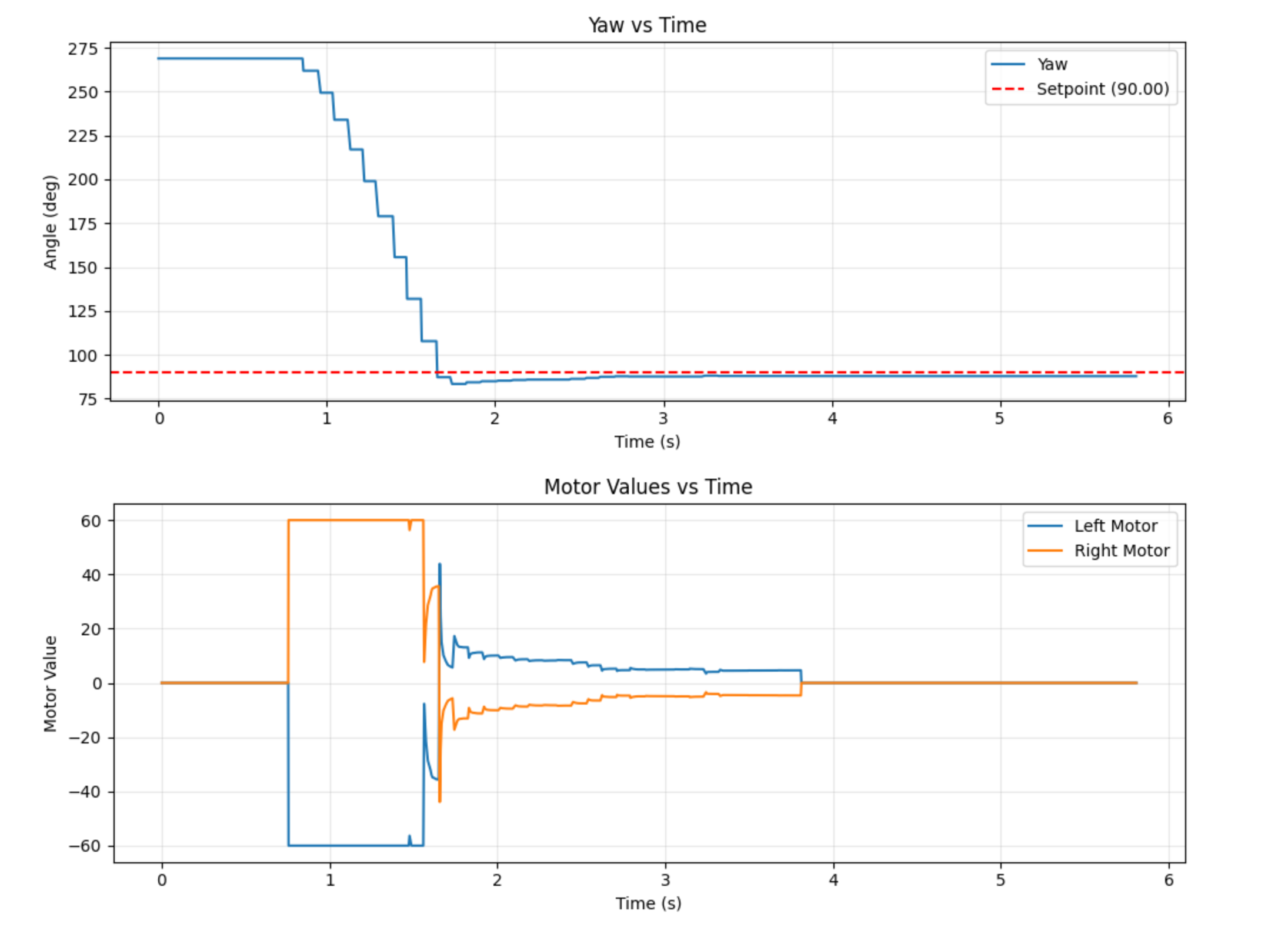 Because I am a 5000-level student and had already set up the PID infrastructure, I chose a full PID controller for this lab. Again, with proper tuning, this gives me a better response and minimal/ideally no, steady-state error. I was able to reuse the same code as in Lab 5, though I made some changes. I changed it to wrap the yaw value from ±180 degrees, even though it reports on the code as 0 to 360 degrees. I did this so that it would try to take the shortest path. For example, if it started at 355 degrees and I set the setpoint to 5, it could rotate towards 0 for a quick turn. But that only works if it doesn’t think that the error is 355-5. I also used PlatformIO build environments and build flags, so I didn’t have to delete any code for the ToF PID controller; I just had a flag for it. The code is shown below.